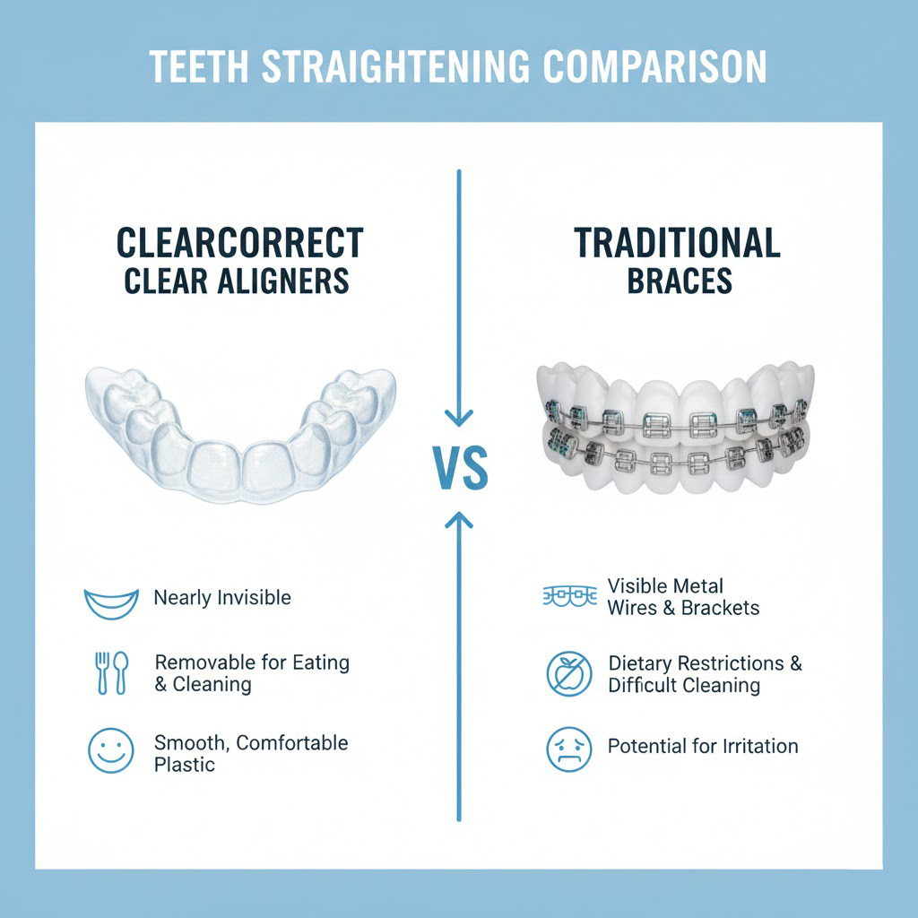 - How They Work: Traditional braces use brackets bonded to your teeth with wires threaded through them. These wires are tightened at regular appointments to keep your teeth moving. ClearCorrect aligners, on the other hand, are based on a 3D model of your teeth. You move to a new aligner every few weeks, following a precise plan without the need for wire tightening.